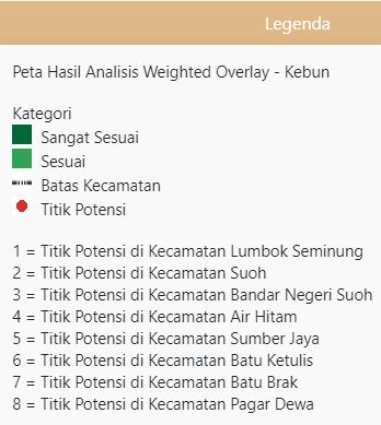 Pada peta kebun yang ditampilkan, terdapat tampilan titik potensi lokasi embung kecil pada setiap kecamatan yang beresiko mengalami kekeringan pada musim kemarau tahun 2023, kecamatan tersebut terdiri dari 8 kecamatan, yaitu: Kecamatan Lumbok Seminung, Kecamatan Suoh, Kecamatan Bandarnegeri Suoh, Kecamatan Air Hitam, Kecamatan Sumberjaya, Kecamatan Batu Ketulis, Kecamatan Batu Brak, dan Kecamatan Pagar Dewa.